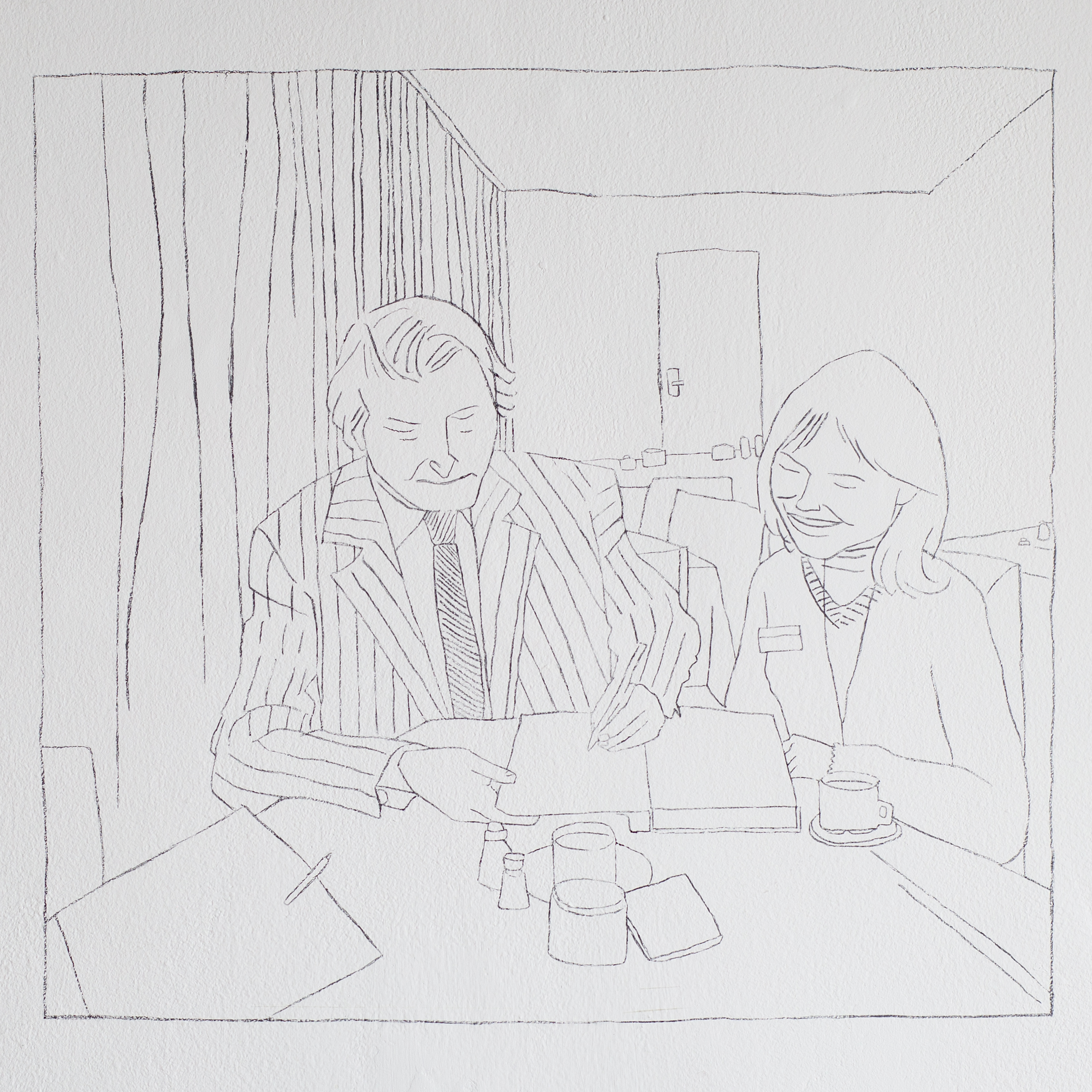 Karen wins the BT young scientist exhibition and signs the book of Ireland with Charles Haughey, 2021, pencil on wall, 45cm x 50cm